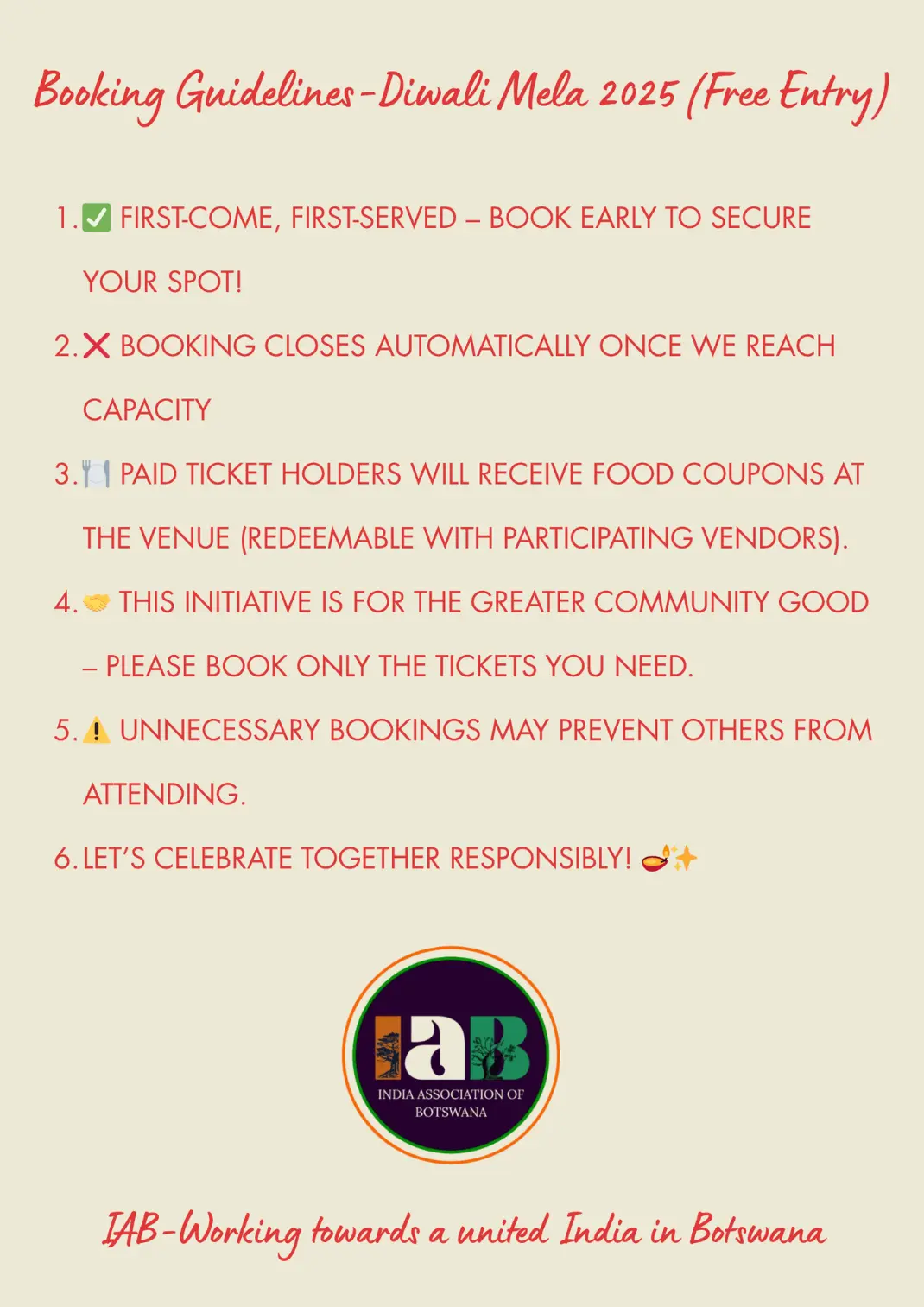 Join the India Association of Botswana (IAB) for an explosive Diwali celebration on Saturday, 8 November, starting 4 PM at Livingston Kolobeng College (LKC) Grounds! Dive into vibrant performances by regional associations, savor mouthwatering food stalls and shopping delights, catch fireworks blasting from the SA team, and win big in our raffle draw. Tickets just P80 (kids under 10 free)—book stalls for P500 online at www.botswanaiab.org. Light up with joy, laughter, and festive cheer! Contact: Gurmeet (71214343), Arun (71 276 100), Ajay (74194835). Don't miss the sparkle—see you there! 🎆🪔✨
