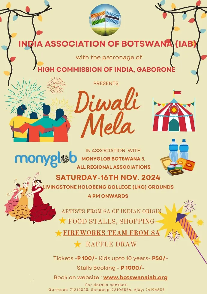 Join the India Association of Botswana (IAB) for an explosive Diwali celebration on Saturday, 8 November, starting 4 PM at Livingston Kolobeng College (LKC) Grounds! Dive into vibrant performances by regional associations, savor mouthwatering food stalls and shopping delights, catch fireworks blasting from the SA team, and win big in our raffle draw. Tickets just P80 (kids under 10 free)—book stalls for P500 online at www.botswanaiab.org. Light up with joy, laughter, and festive cheer! Contact: Gurmeet (71214343), Arun (71 276 100), Ajay (74194835). Don't miss the sparkle—see you there! 🎆🪔✨