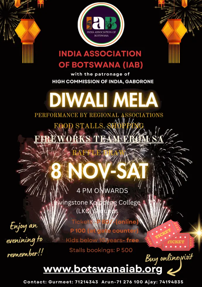 The event is scheduled to take place on Saturday-8th November at LKC grounds in Gaborone. The regional associations will be putting up food stalls and also selling artefacts and handicrafts from different regions of India and Botswana. The show will conclude with exciting fireworks from trained technicians who are being sourced from South Africa.